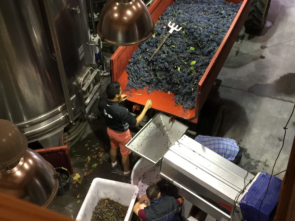 D’abord il faut sélectionner les grappes à garder sur les souches. Quand elles sont bien mûres, nos petites mains les ramassent délicatement avant de les égrapper et de garder le très bon, les baies bien entières, rondes et fruitées.
